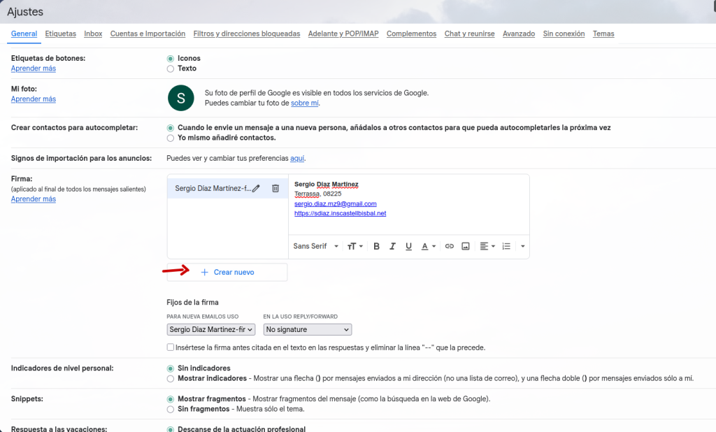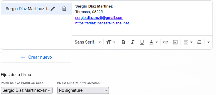 Després hauràs de donar-li a “Crea nova” i podràs posar la signatura que la teva vulguis, quan acabis de fer la teva signatura hauràs de donar-li a “guardar canvis”.