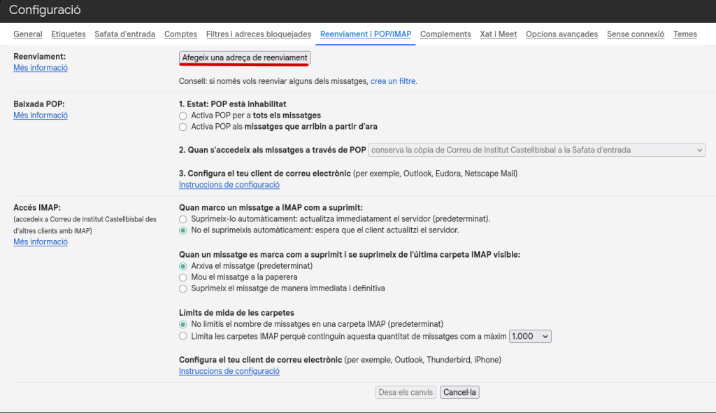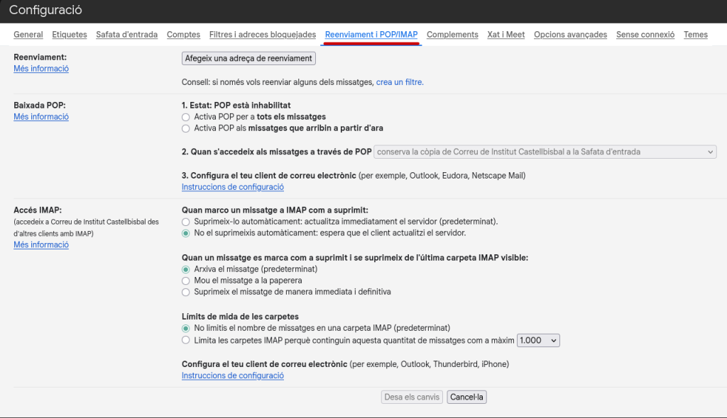Quan estiguis en configuració hauràs d’anar a l’apartat “Reenviament i POP/IMAP”