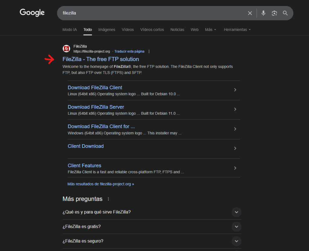 1 pas: Hem de buscar en el nostre navegador “Filezilla” i donar-li a la primera web